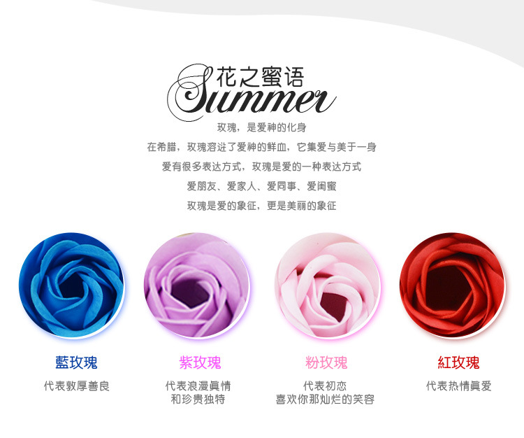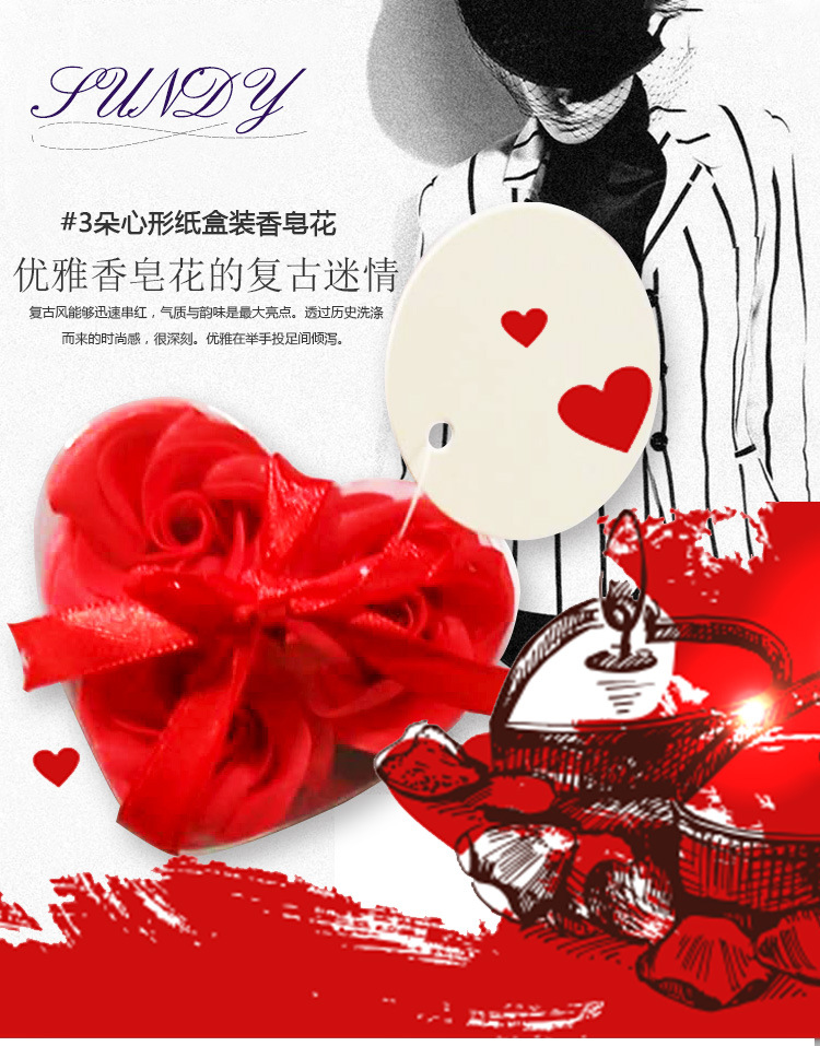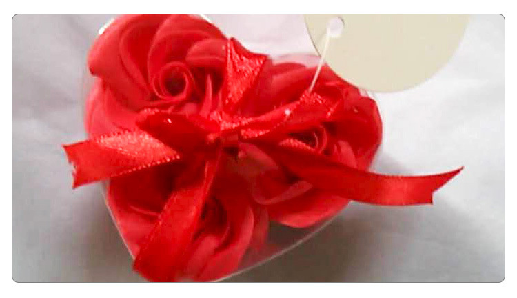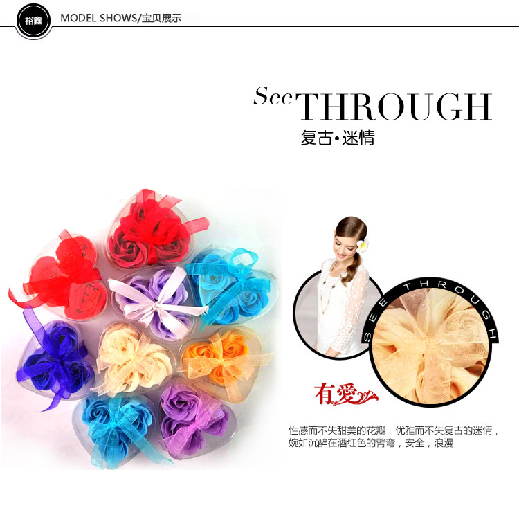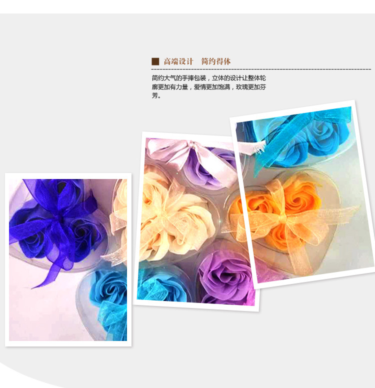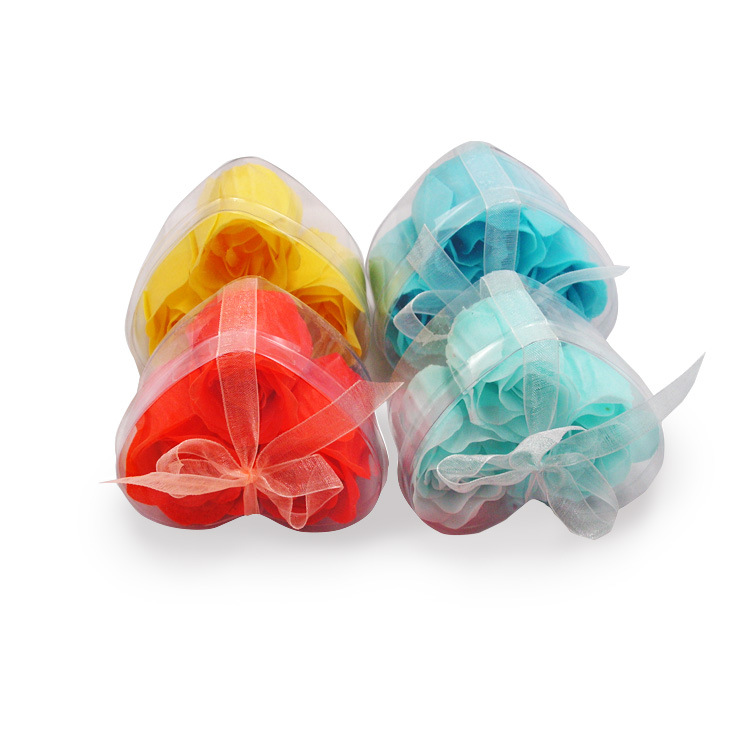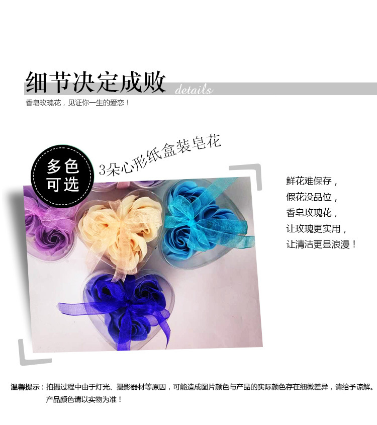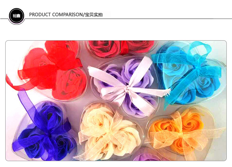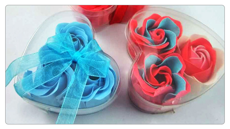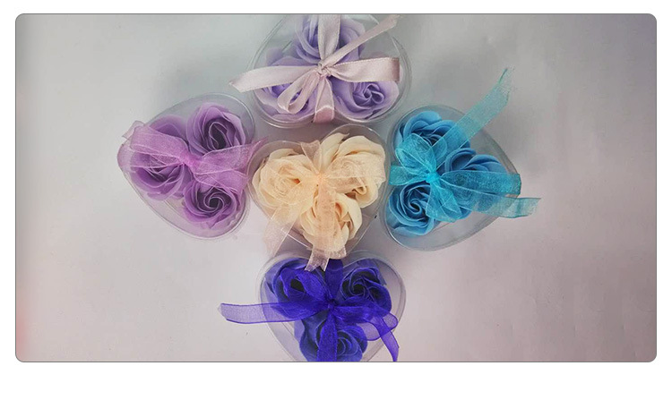 This product is a rose bud composed of soap flower slices. Each box contains 3 pieces, packaged in a transparent PVC heart-shaped plastic box. The product comes in red, purple, pink, yellow, and light green. After purchasing, consumers can give it to friends, relatives, or loved ones.